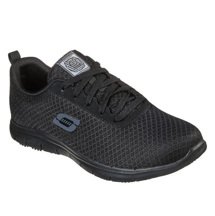Water and stain resistant upper design with Scotchgard® protection. Heel panel fabric overlay with pull on top tab. Lace-up sporty casual work slip resistant comfort sneaker. Slip Resistant rubber traction outsole.