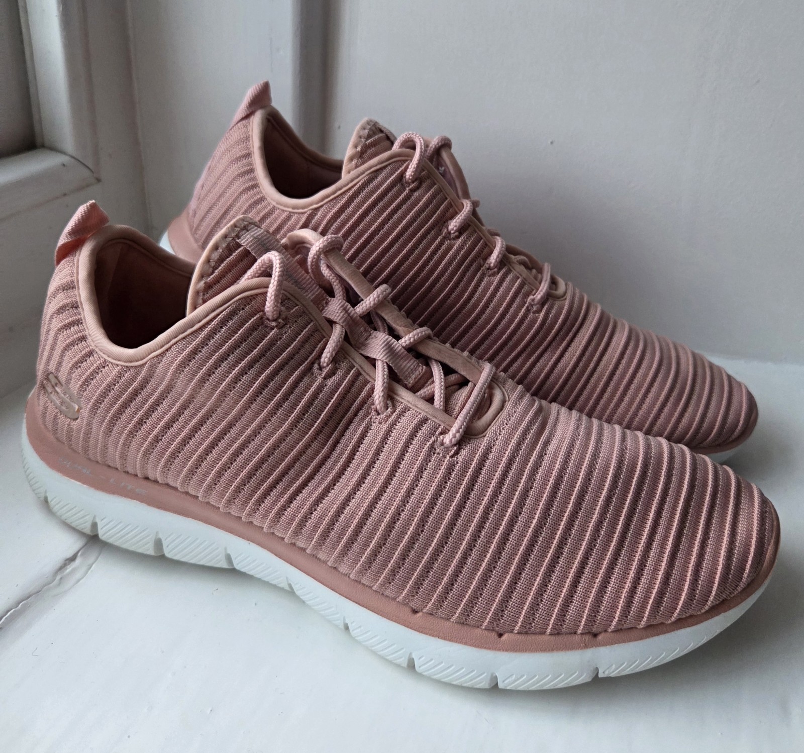 Upgrade your comfort with these stylish and breathable Skechers Flex Appeal 2.0 - Estates sneakers. Sporty Ribbed Knit Upper: Breathable, flexible, and lightweight. These shoes are in good used condition.
