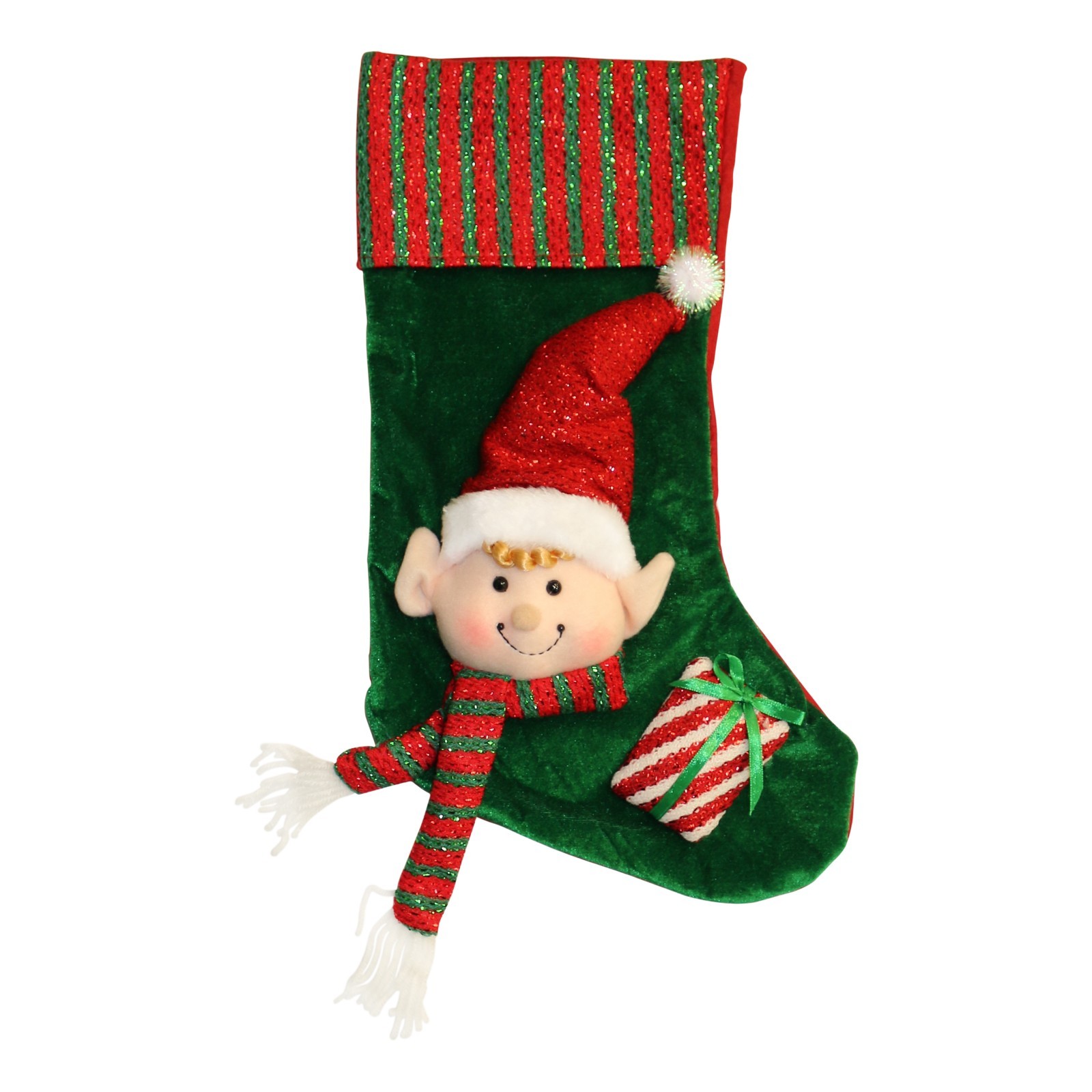Plush Elf Face & Present Green & Red Velvet Effect Christmas Stocking Gift