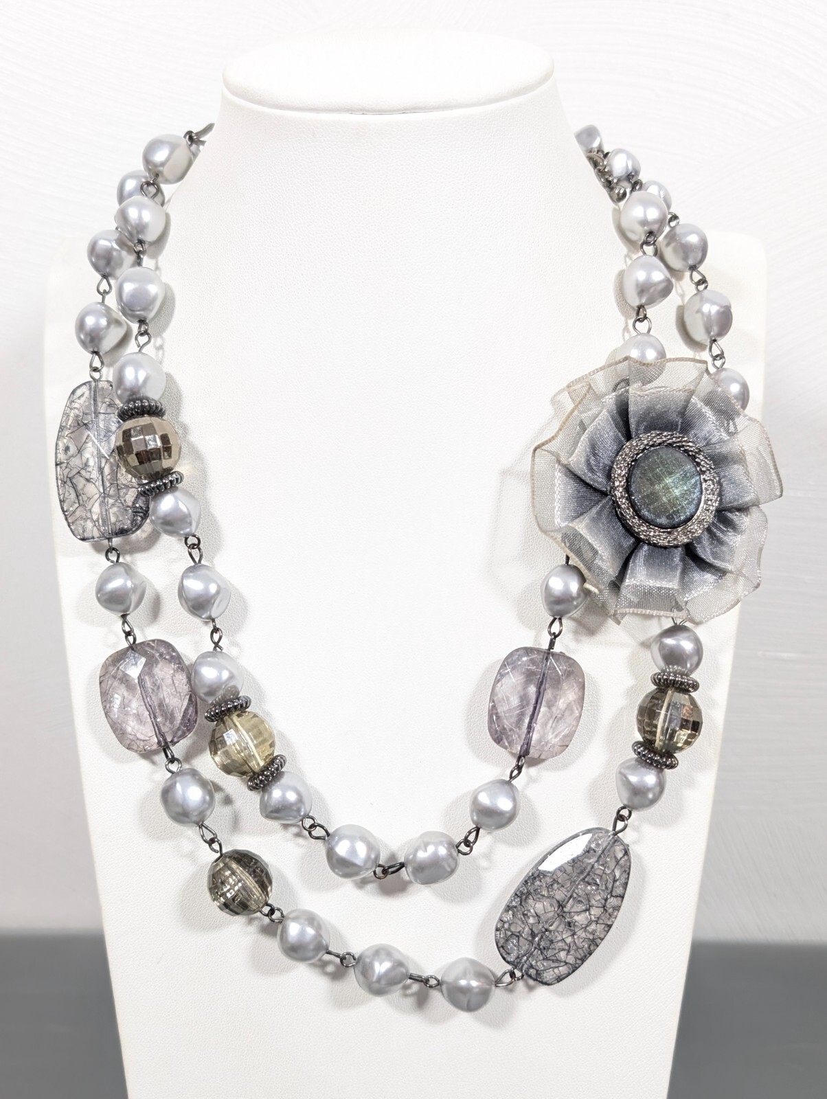 NYC Retro Gray Faux Pearl Multi Strand Layered Flower Bold Chunky Necklace Y2K