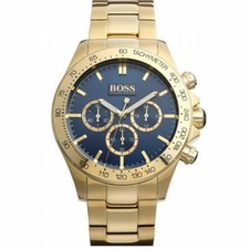 Gents Hugo Boss watch collection. Chronograph feature. Blue dial. Gold Tone Stainless steel case. GOLD TONE stainless steel bracelet. SUPPLIED WITH ORIGINAL BOX / BOOKLET & SERIAL NUMBER ENGRAVED ON THE BACK OF THE WATCH.