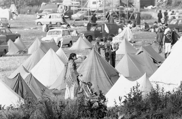 Campsite scene at the Glastonbury festival Worthy Farm Pilton 1971 Old Photo