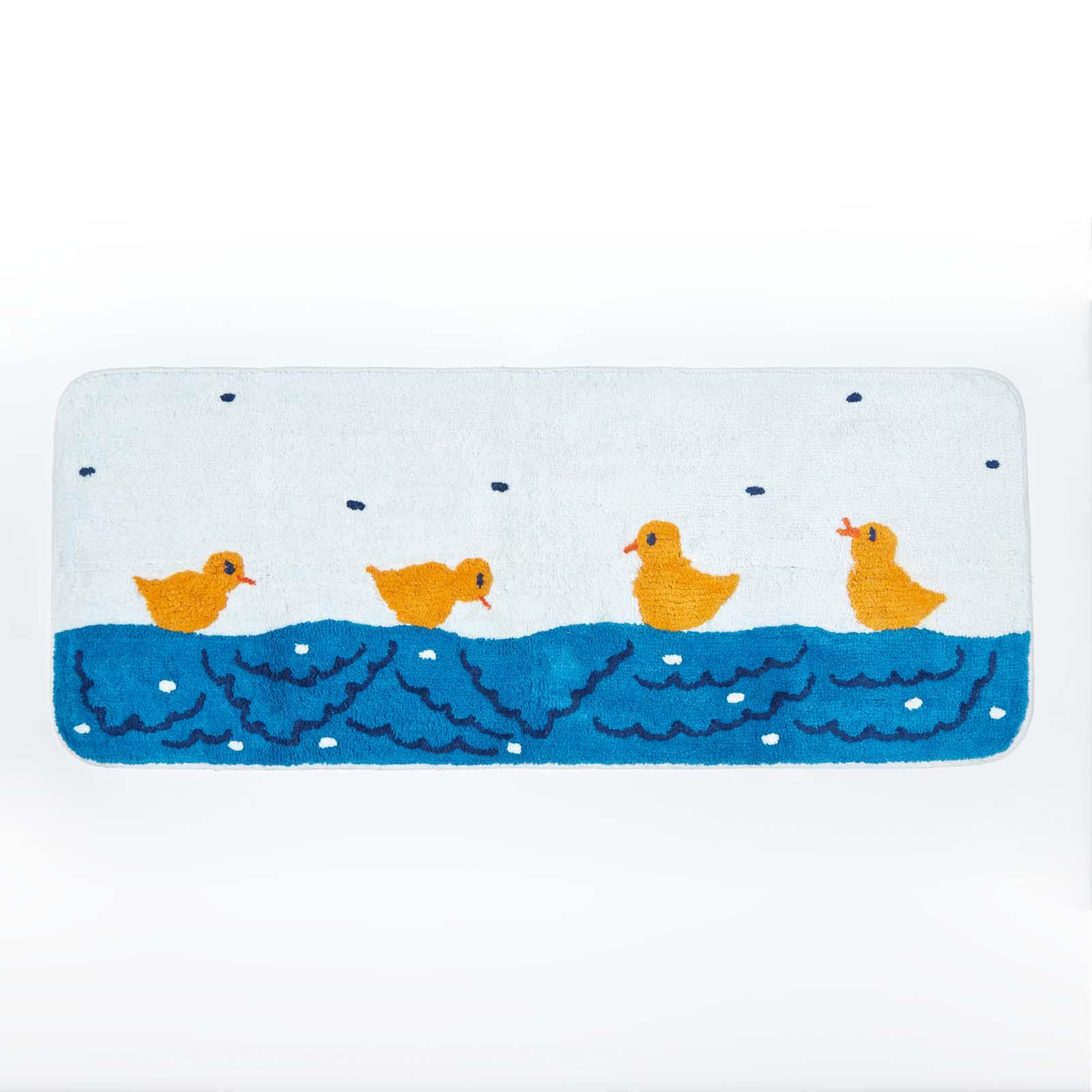 Duck Pond Bath Mat, Pedestal Mat, Bath Runner. These little ducks are quite content swimming around in their little pond. You might even consider them happy. As you would be if you had these super soft, Duck Pond Cotton Bath Mat/Runner and Pedestal Set in Blue and White colour to keep your feet warm and cosy.