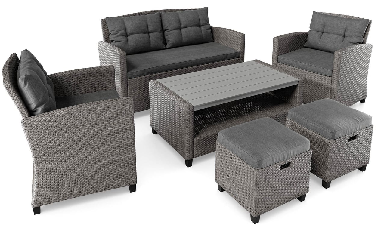 The comfortable and functional FARINZE garden furniture set will prove useful as a garden or terrace accessory. The set,which includes a two-seater sofa, two armchairs, two stools and a coffee table, will allow you to relax and enjoy a comfortable rest outdoors, with a cup of hot coffee in the morning or during an evening with friends.
