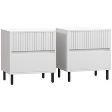 • Elegant design: White bedside tables have textured drawer panel, with gold tone handles. ● 2 x Bedside Tables. Use flat top for an alarm, clock or similar, with low-rise walls for safety. ● Colour: White.