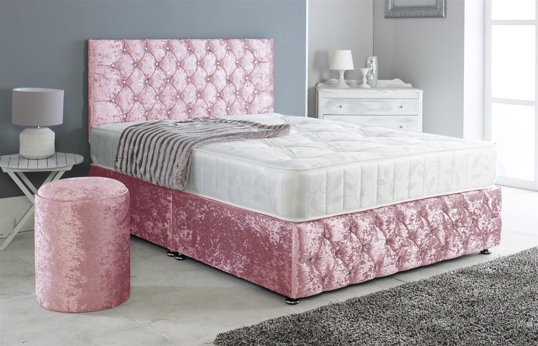 Chesterfield Crushed Velvet Divan Bed with Headboard, Footboard, Mattress and Stool. Perfectly designed for those who value elegance and practicality, this bed set includes a matching footboard and customizable options for the mattress and stool, allowing you to create a bedroom tailored to your preferences.