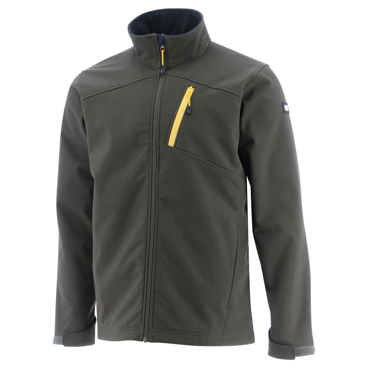 Caterpillar Essentials Shell Jacket Army Moss. Silicone logo label on left shoulder Front zip closure with logo pull Contrast yellow chest pocket with logo pull Zip closure lower pockets Full length interior front storm flap with chin gu d.
