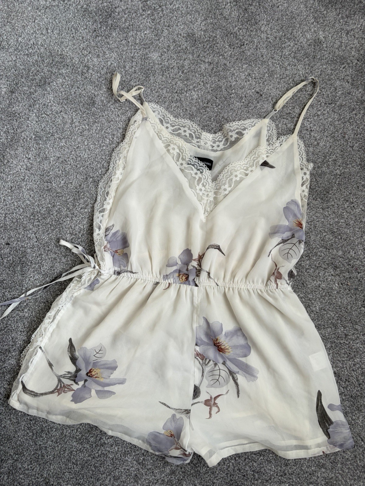 This Pretty Little Thing playsuit in size 10 is a stylish addition to any summer wardrobe. The cream lace cami design with a floral print adds a touch of femininity, perfect for casual occasions. With a regular fit and machine washable fabric, this one-piece playsuit from the popular brand PRETTYLITTLETHING is both comfortable and easy to care for. The strappy accents give it a trendy and chic look, making it a versatile piece for any woman's wardrobe.