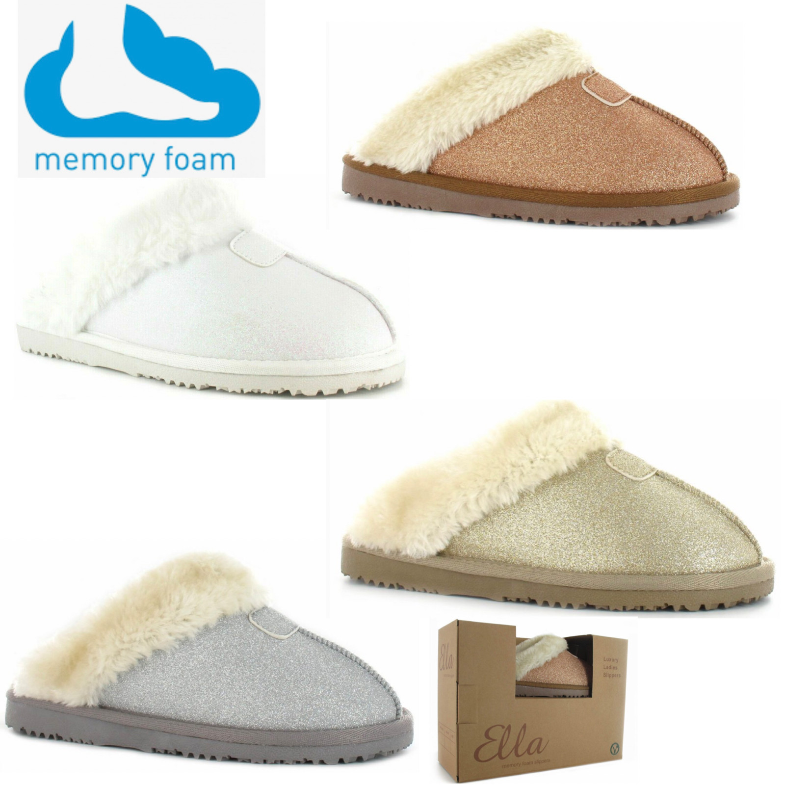 ELLA SPARKLE LADIES MULE SLIPPERS JILL NEW WOMENS MEMORY FOAM WINTER SLIDERS