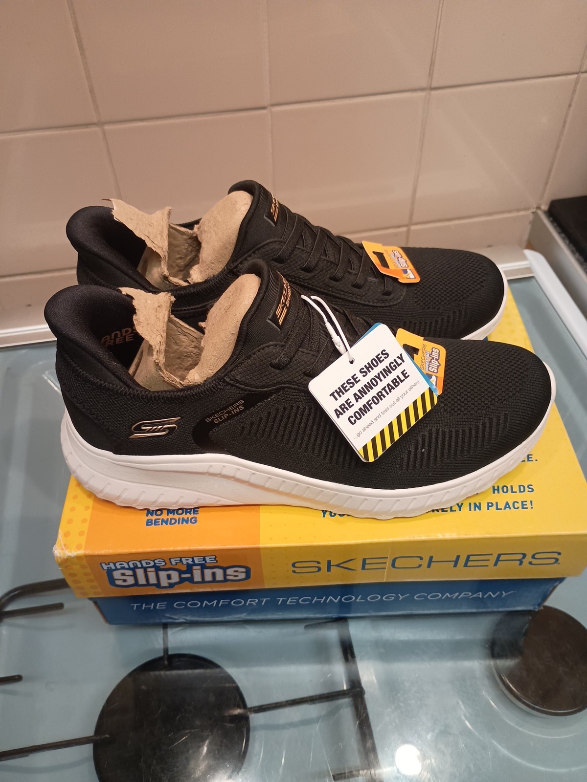 Popular Skechers Hands free Slip-ins trainers with Skechers Heel pillow , knit upper with stretch laces & cushioned Memory foam insoles. These trainers are machine washable on a cool wash. Brand new Size 5.5