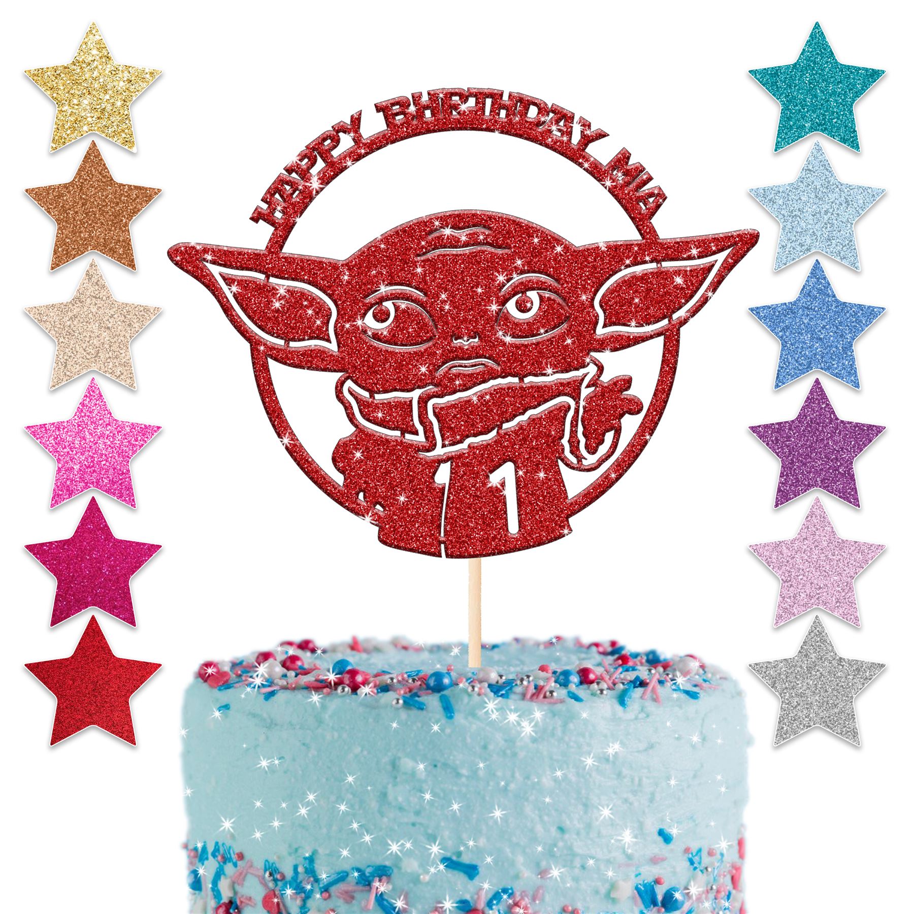 Handmade Personalised Baby Yoda Cake Topper. Make your celebration unforgettable with our exquisite personalised cake toppers, perfect for any occasion! Each topper features double-sided glitter or, for mirror toppers, a plain white back for easy mounting with the provided food-safe bamboo skewers and glue dots.