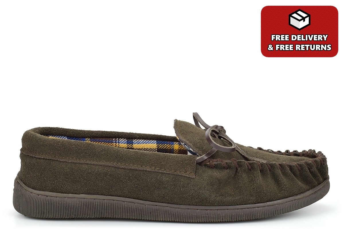 Mens Real Suede Moccasin Slippers Genuine Leather Moccasins Rubber Sole Brown