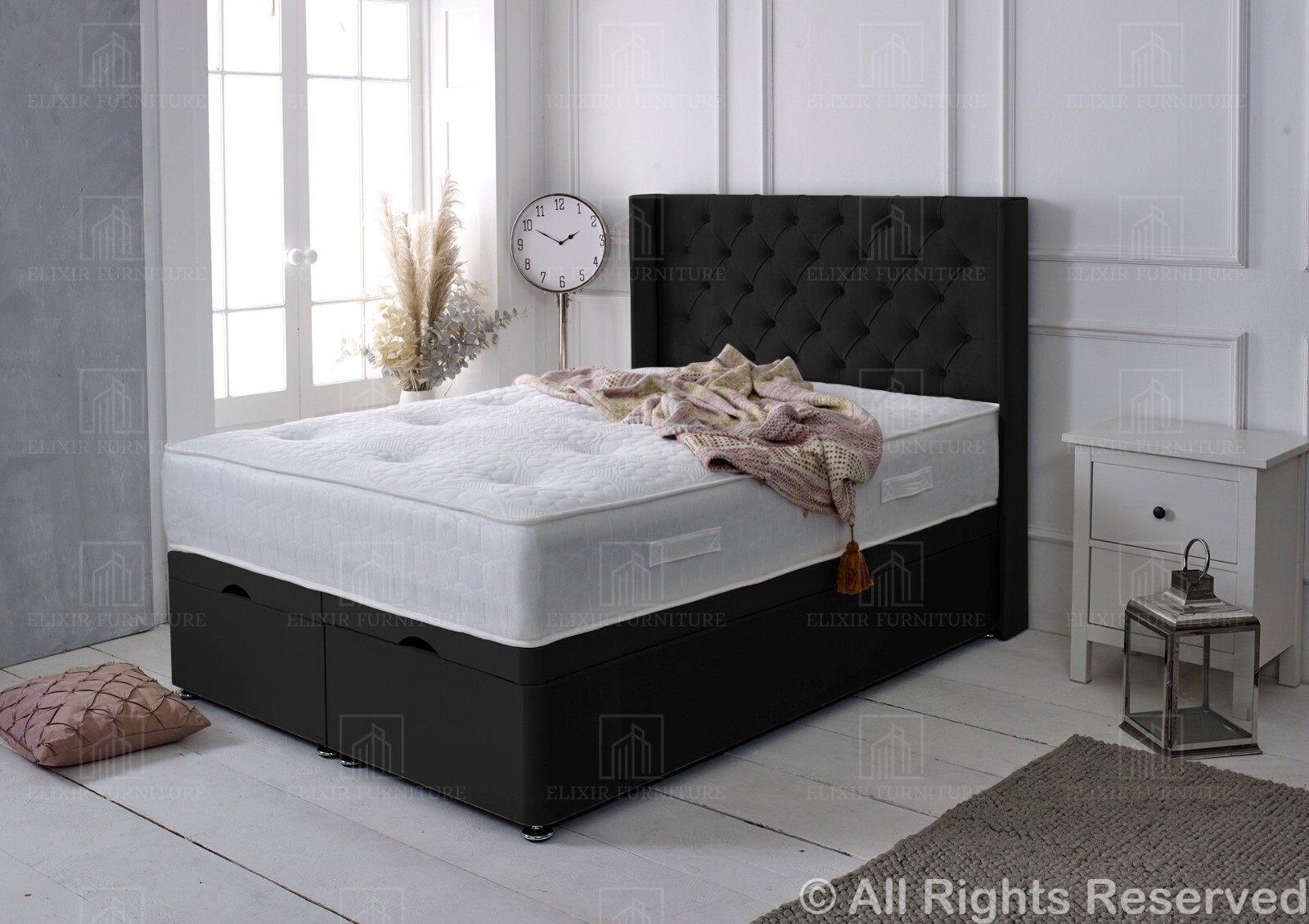 PLUSH VELVET STORAGE OTTOMAN BED + CHESTERFIELD WINGED FLOOR STANDING HEADBOARD. Enjoy your good night’s sleep and awaken refreshed. PLUSH VELVET. 【Comfortable & Breathable Cover】 -Hypoallergenic fabric cover with airy holes perfectly creates a comfy sleeping surface and properly circulates air flow while you sleep.