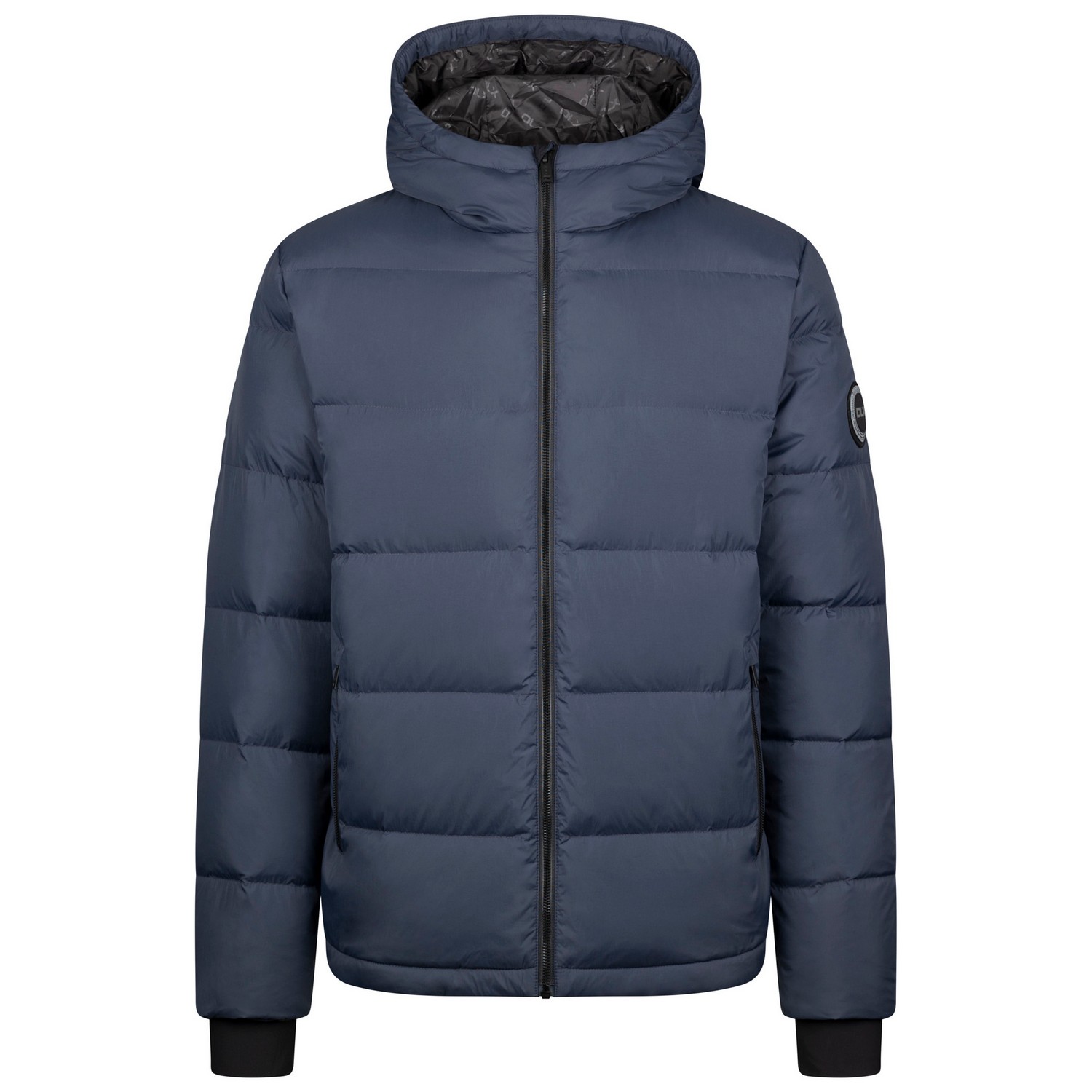 Filling: Down. Design: Plain, Sleeve Patches. Neckline: Hooded. Cuff: Inner Ribbed. Sleeve-Type: Long-Sleeved. Hood Features: Sew-On. Pockets: 2 Side Pockets. Fastening: Full Zip.