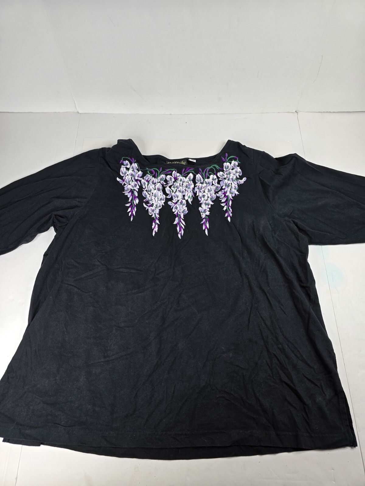 Bob Mackie Shirt Top Womens 2X Black Pullover Wearable Art Cotton Embroidered please check pictures for wear and measurements Please compare the measurements provided to an item you own that fits well. We do not accept returns due to sizing issues if measurements are listed