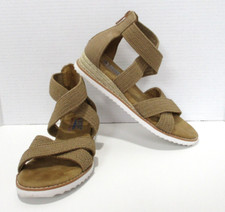 BOBS from Skechers Desert Kiss Hi Tea Time sandals combine eco-conscious style with everyday comfort. These vegan-friendly wedge sandals feature a soft fabric upper with quilted crisscross straps and an elasticized slingback strap for a secure fit. Designed with a contoured Memory Foam footbed and a jute-wrapped platform midsole, they provide cushioned support and a touch of bohemian flair. The durable traction outsole ensures stability for all-day wear.