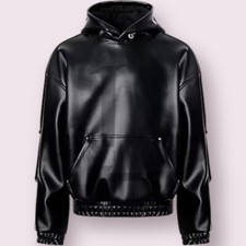 Men's Black Premium Leather Handmade Hoodie Genuine Lambskin Leather Hoodie