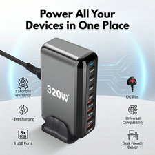 **600W USB C Desktop Charging Station â GaN³ 8-Port Fast Charger Hub with UK Plug** Power all your devices effortlessly with this **600W GaN³ 8-Port USB-C Charging Station**. Featuring 5 PD USB-C ports (up to **PD140W**) and 3 QC USB-A ports, this compact hub allows you to simultaneously charge laptops, smartphones, tablets, and accessories without the clutter of multiple chargers. **Key Features:** - **Massive 600W Total Output:** Ideal for high-watt laptops and multiple devices. - **GaN³ Technology:** Smaller, cooler, and more efficient for faster charging. - **Smart Power Allocation:** Automatically distributes power for optimal speeds. - **Safety Protections:** Over-current, over-voltage, short-circuit safeguards, and fire-retardant shell. - **UK Plug + 1.5m Power Cord:** Perfect for UK sockets with convenient placement options.