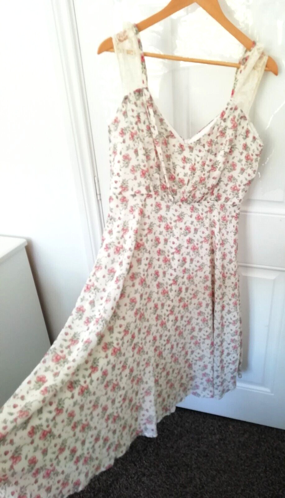 Boohoo Occasion Size 14 Dress White Pink Ditsy Floral Lace Trim Back Zip Lined