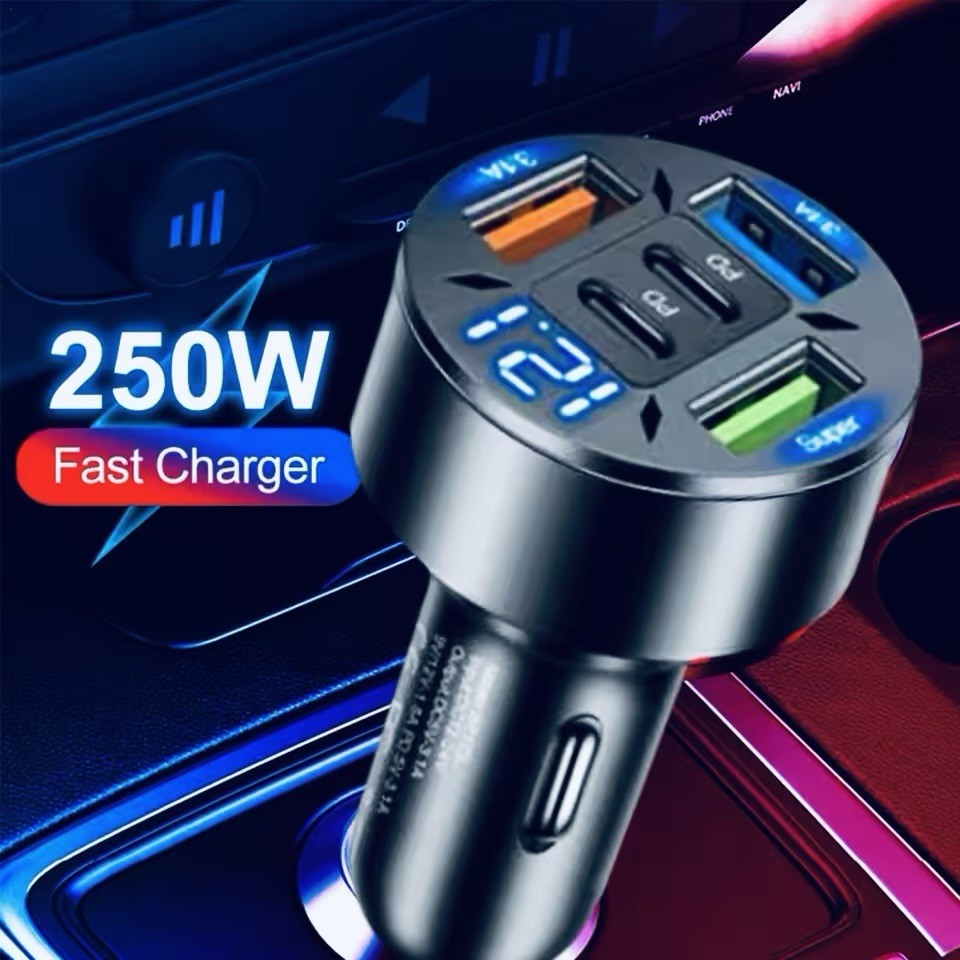 The 250W 5 Port Car Charger is a versatile and fast charging adapter designed for iPhones and other Type C devices. With USB-C PD and QC3.0 technology, this charger can quickly and efficiently power up to 5 devices simultaneously while on the go. Its compact design and cigarette lighter mounting make it easy to use in any car, and the durable plastic construction ensures longevity. The sleek black colour adds a stylish touch to this essential mobile phone accessory. Compatible with a universal range of brands and models, this car charger is a convenient and practical choice for those needing fast charging capabilities on the road.