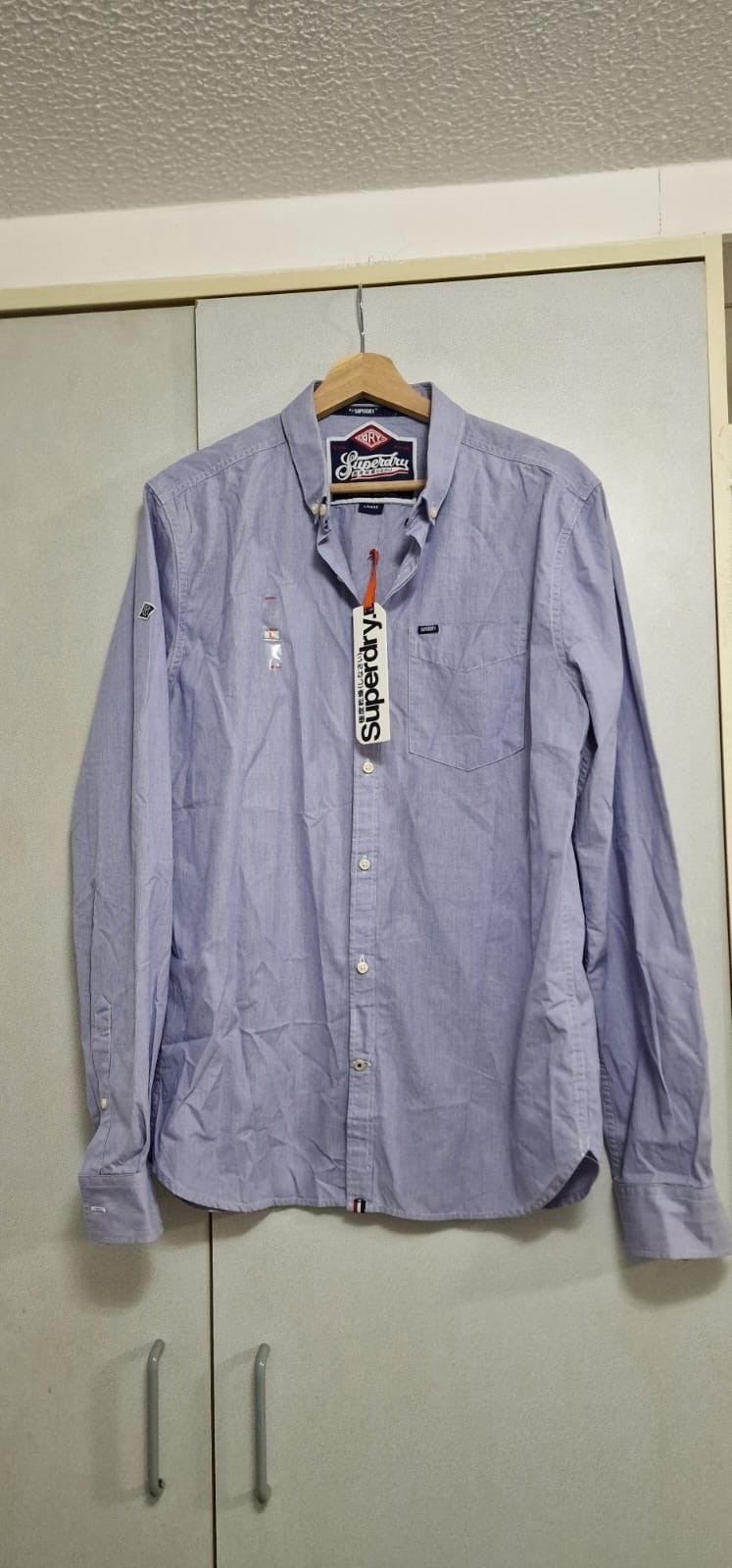 The Superdry Men's Long Sleeve L Blue is a casual button-up shirt made from cotton, featuring a collared neckline and regular fit. The shirt is machine washable and is designed in India by the brand Superdry. The classic blue colour and button accents add a stylish touch to this wardrobe staple, perfect for everyday wear.