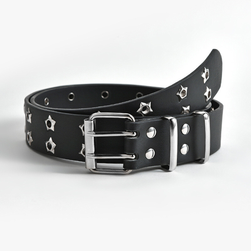 Pattern Type:Star Eyelet. Belt Buckle Material:Alloy. With this fully adjustable buckle, you can adjust the belt to whatever size you need. Belt Width:3.3cm(double). Belt Length:110cm. Belts Material:PU leather.