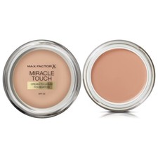 MAX FACTOR Miracle Touch Skin Perfecting Foundation SPF30 11.5g CHOOSE SAHDE . The unique Max Factor Miracle Touch Foundation, upgraded with hyaluronic acid and SPF 30. Its solid-to-liquid formula floats over skin texture for an instantly perfected, smoother look.