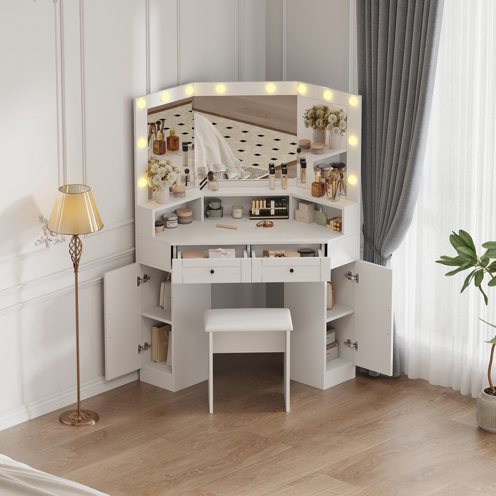 Modern Corner Dressing Table +Stool Set LED Lights 3 Mirrors Drawers Makeup Desk