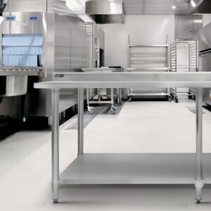 Whether you work in a Michelin star restaurant or a greasy spoon café, you need the space to prepare your delicious food. So that ideal work surface has got to be the right size, adjustable, and (most importantly) hygienic! Well look no further than the KuKoo Catering table measuring approximately 5ft wide. Made from corrosion resistant and easy to clean 430 stainless steel, these tables are perfect for any kitchen. Approximately 5ft wide Made from 430 grade stainless steel, which is corrosion resistant (particularly useful for cooking with acidic food like tomato sauce or fruit) 100mm upstand to make cleaning easier and protect the wall Store accessories and equipment on the lower shelf which can adjust up or down the table for easier storage And even alter the individual feet to compensate for any uneven floors 250kg weight capacity Flat packed for easy assembly FREE 2 x Microfiber Cloths for perfect cleaning Stainless Steel Work Surface The adjustable features mean you can really make each commercial table suit your kitchen. Forget folding up bits of paper to compensate for any uneven floor surface, with this work bench you can twist and correct the feet to keep it steady. Plus, if you like to keep things tidy you can store stuff on the lower shelf, which can be moved up or down the table legs depending on how much you’re storing. Each of the edges is completely flat so tables can stand side by side or up against appliances like the fridge, and the back of the splash back will sit flat against the kitchen wall. Don’t forget that the table isn’t bolted down or fixed, like your work surfaces at home – so if you’re into feng-shui you can move it wherever you like. Specifications: Dimensions: 90cm H x 150cm W x 60cm D Weight: 28.5kg