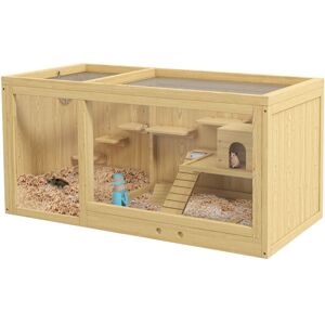 A spacious home where small pets can freely climb, play and roam. This three-level PawHut hamster cage has two huts, which they'll use to rest and sleep, whilst the ladders let them easily get around. There are two openings, at the top and the front, so cleaning is easy, especially with the pull-out tray underneath. You'll watch them through the glass window, as they settle into their new condition, which is made of sturdy fir wood – providing a long-term and homely habitat. Specifications: ● Colour: Natural Wood ● Material: Fir wood, Metal, Acrylic glass ● Overall Dimension: 99W x 50D x 69H cm ● Door size: 88W x 21.5H cm(Front Door), 99L x 50W cm(Top Roof) ● Inner Platform size: 95.8L x 34W (Second layer), 95.8L x 27.5W cm(Third layer) ● Each of Ladder size: 24.4L x 10W x 1.2T cm ● Tray size: 94.5W x 47.5D cm ● Wheel size: Φ3.7 cm ● Recommended Pet Type: Hamsters, mice, and other small rodents ● Item Label: D51-319ND Features: ● A three-level design that has two huts and two ladders,