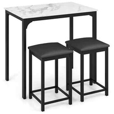 General description Are you looking for stylish and functional furniture for your home? Our 3-piece bar table set includes a sleek counter-height table and 2 upholstered bar stools, perfect for cozy breakfasts or casual gatherings. The contemporary tabletop with a patterned finish exudes modern elegance and seamlessly complements any interior decoration, making it suitable for the living room, dining room, or bar. Technical specifications Color: White + Black Material: MDF, PVC, Sponge, Metal Size of the Table: 90 x 60 x 82 cm (L x W x H) Size of the Stool: 35 x 35 x 53 cm (L x W x H) Weight Capacity of the Table: 90 kg Weight Capacity of Each Stool: 150 kg Net Weight: 17 kg Usage The stools can be stored under the table to save space. High-density sponge cushions provide long-lasting sitting comfort. Comfortable footrests help relax and relieve foot fatigue. Wide desktop space securely holds items. Anti-slip footpads enhance safety and stability. Skin-friendly PVC leather covering