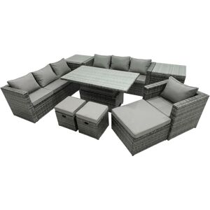 Sleek modern design meets outdoor durability! This sophisticated rattan set enhances any space - from urban balconies to country gardens. High-quality PE rattan and galvanized steel provide lasting beauty that withstands harsh British seasons. Set Dimensions: 1 x Three Seater Sofa : 177W x 65D x 66H cm; 1 x rising dining table: 140L x 80W x 68/48H cm (height up 68,down 48); 2 x Chair :74W x65D x66H cm; 2 x Fully assembled footstools Size: 40L x 40W x 34H cm; 2 x Big Footstool Size: 65L x 65W x 35H cm; Sofa Weight Capacity: 250kg; Table Weight Capacity: 80kg; Dark grey mixed rattan with dark grey fabric .Color may some difference due to light or monitor .we are unable to return the item due to color problem . Items Comes Flat Packed And Easy Assemble, Sturdy Galvanized Steel Tube Metal Frames With Powder Coating To Prevent The Rust; Flat PE Rattan Completely Made By Hand, 5mm Thickness transparent Tempered Glass With Sucker On Surface To Prevent Sliding; Fimous Rattan Lounge Sofa Rising Dining Table Set & 4 Footstool in Dark Grey