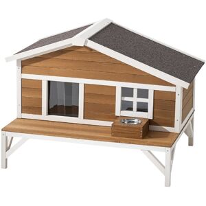 43" Wooden Cat House Provide your feline friends with a comfortable and safe haven using this 43-inch wooden cat house. Constructed from sturdy fir wood and featuring insulated foam panels, it helps maintain a warm environment during colder seasons. The slanted roof and elevated base offer protection from moisture, while the spacious side door and jump platform ensure easy entry and additional activity space. Multiple windows promote ventilation and natural light, and the detachable feeding station simplifies maintenance. Perfect for placement in your backyard, garden, balcony, or inside your home. Built to Withstand the Elements and Designed for Longevity Cozy and Well-Insulated A Cozy and Inviting Environment Versatile Feeding Zone Modern and Adaptable Style Key Features Weather-Resistant and Sturdy: Made from durable fir wood panels and featuring an asphalt-coated roof, this outdoor cat shelter is designed to withstand rain, snow, wind, and sunlight. Its slanted roof and 2.56-inch