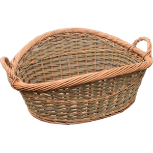 Lovely oval wicker laundry basket with a thick roll top weave and external handles. Finished in full double steamed buff and green willow. Stands 28cm tall including handles Measurements can vary slightly due to the product being made from natural materials Size Length 66 x Width 55 x Height 28cm