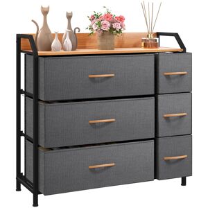 Repurpose space with this versatile dresser tower, which features 6 drawers designed for efficient organization. The layout includes 3 larger drawers on the left and 3 smaller drawers on the right, allowing you to effectively categorize items based on their size. The premium fabric drawers slide open and close effortlessly, while the sturdy steel frame and waterproof wood tabletop provide a stable surface for lamps, clocks, books, and glasses. Side guardrails and a backboard prevent items from falling off, ensuring everything stays securely in place. This modern storage organizer blends seamlessly into living rooms, bedrooms, hallways, entryways, closets, and nurseries, making it an ideal addition to any space. Rebrilliant Colour: Dark Grey