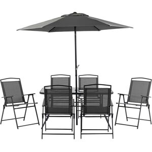 Use this fashionable garden dining table and chair set to create a warm and convenient dining space in the outdoor garden. The aluminium frame is sturdy and also lightweight and can be used for a long time. The tempered glass tabletop can save you a lot of cleaning time. The 8 seater garden table set can seat up to eight people, providing a comfortable place for your outdoor dining. Come and have this garden furniture set, enjoy the outdoor fun with family and friends.Features:- 9 piece patio dining furniture seats 8 people: 1 x table, 4 x armchair, 4 x footstool- The chairs and the footstools can be stored under the table to save space- Rope decoration on the chair arms and backs looks stylish and elegant- Aluminium tubes ensure a light and strong structure- The tempered glass table top is easy to wipe clean- Cationic polyester fabric is not easy to fade and feels soft- All cushion covers have zippers for easy removing and washing- Assembly required