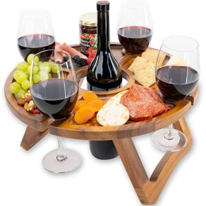 Slip into your backpack or carry it around using the included tote, and this mini picnic table is ready for your next adventure or get together with friends. Perfect for concerts in the park, romantic evenings, days at the beach, picnics, wine tastings and festivals. Designed to stand on any surface including grass and sand. You don't have to balance your favorite bottle of wine on uneven ground or fumble around to keep full glasses from tipping over. Gone are the days of balancing snacks on your lap while trying to enjoy a night out with friends and keeping food sand free while relaxing on the beach. Elevate your favorite drinks and foods off the ground to keep them safe and clean. There's nothing worse than opening your favorite bottle of champagne only to have it spilled on the floor because you had no secret place to put it. The hole in our wine picnic table was designed to hold bottles of your favorite beverages and keep them safe and spill-free. We also know the difficulty of