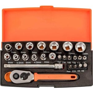 The Bahco S330L Metric Socket Set is ideal for the home, garage or car, this Bahco socket set will give years of service. The set has all the most common sized sockets, so the set is well equipped to tackle any job in or around the home. It is especially suitable for the motor trade. Complete with sockets made from hardened chrome vanadium. Comes with a dynamic drive profile and a quick release ratchet. The ratchet is fitted with a compact sturdy soft grip handle with a thumb slide direction lever. It is supplied in a sturdy high density polythene carry case with sponged lining that is labelled with the corresponding items for quick and easy identification. Conforms to DIN 3120 /ISO 1174. Supplied in an impact and oil resistant case: 12 x 3/8in Hex Sockets: 10, 11, 12, 13, 14, 15, 16, 17, 18, 19, 20 and 22mm. 11 x 3/8in Deep Hex Sockets: 10, 11, 12, 13, 14, 15, 17, 18, 19, 20 and 22mm. 1 x 3/8in 60 Teeth Quick Release Ratchet 2 x 3/8in Extension Bars: 75mm (3in) & 150mm (6in). 1 x