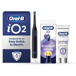 The iO2 electric toothbrush combines gentle micro-vibrations with a unique dentist-inspired round brush head for a purifying feel of a professional clean. Replace your Oral-B iO toothbrush head every 3 months for the best results. The Oral-B iO Series Radiant White Replacement Brush Heads combine powerful but gentle micro-vibrations with our unique dentist-inspired round brush head design for a professional clean feeling every day. Designed exclusively for Oral-B iO electric toothbrush handles the Radiant White brush heads help remove up to 100% more plaque than a regular manual toothbrush leaving teeth feeling clean and bright. The Radiant White brush head uniquely combines perfect angle bristles with polishing petals to contact and polish all areas and remove surface stains for a whiter smile. Dentists recommend changing your toothbrush head every 3 months for best results. Enjoy superior cleaning power with the only refill brush heads designed exclusively for - and guaranteed to fit - your Oral-B iO electric toothbrush. Oral-B Pro 3D White Clinical Intensive Whitening toothpaste is clinically proven for whiter teeth in 1 day by removal of surface stains. It is Oral-B's best whitening toothpaste with its unique Ionic Technology: It loosens stains without scrubbing removes stains with Ionic Whitening protects teeth from future stains and is suitable for sensitive teeth.