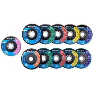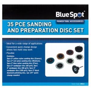 This BlueSpot 31 piece Sanding and Grinding Accessory Set comprises the following: 10 x 3/4in Sanding discs. 1 x Mandrel. 2 x Sanding shanks: 1/4in, 1/2in. 14 x Sanding bands: 1/4in (x8), 1/2in (x6). 2 x Aluminium oxide grinding stones. 2 x Silicone carbide grinding stones.