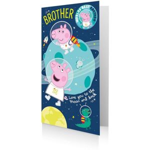 This Official Peppa Pig birthday card is super fun with it's space theme! Peppa and George and George's dinosaur, of course, are on the cover floating through space exploring the planets. "Brother" and "Love you to the moon and back" is printed onto the front of this card. There is also the opportunity for your brother to celebrate with George all day as there is a removable badge he can wear just for his special day. The badge features George and the caption "World's Best Brother". The inside of this birthday card includes George walking on a planet! There is the pre-printed message "Have fun on your birthday adventure!" however there is still plenty of space to write your own personal message to your brother.