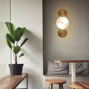 The luxurious and modern Glass Golden Wall light. This elegant wall light features a circular design with three beautiful lights that emit a soft, ambient glow. Made from high-quality metal and adorned with sparkling glass, it creates a mesmerizing visual effect. The gold and white colour scheme adds sophistication and charm to any space, making it ideal for kitchens, bedrooms, and living rooms. MOSSODOR