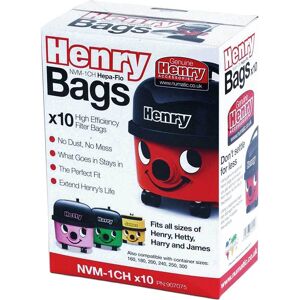 High efficiency filter dust bags that fit all sizes of Henry, Hetty, Harry and James. Also compatible with container sizes: 160, 180, 200, 240, 250, 300 Henry's innovation self-seal tab locks all the dust in the bag, meaning emptying with no dust and no mess. Henry bags use 3 layers of material increasing filtration, so what goes in stays in. Designed for Henry by Henry, maximising capacity and airflow, delivering peak suction. Using genuine approved Henry bags will ensure you get optimum cleaning from Henry for the life of the product. Using unapproved bags can damage the machine and may invalidate the warranty. Features & Benefits • No dust, no mess • What goes in stays in • The perfect fit • Extend Henry's life Specifications • Pack Quantity: 10