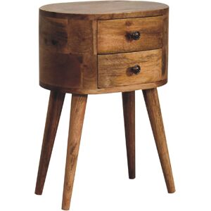 This mini solid wood bedside has been constructed from 100% solid mango wood in a oak-ish finish and offers a uniquely shaped design with rounded edges. It features 2 mini drawers which come with a shiny knob and Nordic-style legs. A great, simple addition to the bedroom. Alpen Home