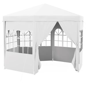 Choose this Outsunny hexagonal gazebo for outdoor gatherings this season. A large size for plenty of hosting room, with removable walls to switch from an open atmosphere to closed in an instant. The included guy ropes and ground nails add to the stability. The zip fastening on the main door allows you to enter and leave easily. This marquee gazebo with sides is finished with transparent windows to see through the other side. Feature: Six walls with hook and loop fastenings to taken on/off easily Zipped door for easy access and ventilation Transparent windows to see clearly inside/outside 12 water leakage holes to prevent rainwater build-up Six guy ropes and 12 ground nails included to pin and secure to the ground Spiral connector tubes and protective PP sleeves on the pipes Metal frame for a tough and solid core structure Assembly required Specification: Colour: White Material: Metal, PE Overall Dimension: 3.85L x 3.32W x 2.5Hm Eave Height: 1.98m Side Length: 1.97m Door Size: 1.95W x 1.95H m Window Size: 1.78W x 1H m Item Label: 84C-196V01WT NEVER leave your shelter unattended take it down before a major storm rolls through. Always use both the included stakes and the guy ropes provided when it is used 1 x Party Tent 6 x Pull Ropes 12 x Ground Stakes 1 x Manual