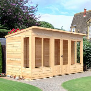 The stylish Alora Summerhouse is a wonderful addition to enhance your outdoor living. Features double doors to the front giving excellent access for furniture. This lovely pent roof garden room is constructed from high grade overlap cladding to the walls over 34mm strong framing with OSB floor and roof. Completed with acrylic safety glazing throughout. Dipped base coat preservative ready for you to top coat. Shire GB