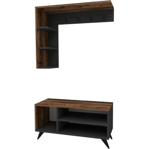Crafted from an 18 mm melamine board, the hallway coat rack with shelves offers comfort, sturdiness, and style. Four metal hooks and 3 tier wall shelves provide ample open storage space, while the 3 shelf bench adds a touch of convenience for shoe storage. Its solid plastic legs, edges banded with PVC edge band, and water-resistant engineered wood surface ensure hat stand will last for years to come. Easily assembled with a power drill and screwdriver. Material: The coat rack is made of an 18 mm thick quality melamine board. The manufactured wood surface is water-resistant to some extent and the edges are banded with PVC edge banding tape. Hooks are quality iron metal. First-class assembly/installation hardware and accessories are used. Our products are produced from certified quality raw materials that do not contain carcinogenic substances and comply with European Union health norms. Cleaning: You can clean your furniture with a damp cloth. Avoid prolonged contact with your product with copious amounts of water. Assembly: The product will be delivered to the customer in the original package as disassembled. It is designed to be assembled by the customer using a power drill and screwdriver. Assembly instructions and installation hardware are included in the package. Product parts are numbered with stickers by the assembly guide for fast and error-free installation. Note that the top left shelves can not be assembled to the right sight side. Corrigan Studio Colour: Light Walnut & Anthracite