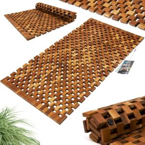 Elevate your bathroom experience with our exquisite bath mat. A stylish addition that effortlessly transforms your space into a Zen oasis. Crafted from FSC-certified, weather-resistant acacia wood, this mat offers a luxurious alternative to traditional textile bath mats, bringing a spa-like touch to your home. Designed for both form and function, our bath mat boasts a rich colour palette, enhancing the aesthetic appeal of your bathroom or sauna area. The robust acacia wood construction ensures durability, while the pre-oiled finish protects against dryness, preserving the mat's beauty over time. Say goodbye to moisture concerns with our innovative design—moisture is not absorbed but swiftly evaporates from the surface. The anti-slip, floor-protecting rubber pads provide stability on wet floors, preventing scratches and ensuring a secure grip. Cleaning is simple—just wipe with a damp cloth and let it air dry. Versatile and practical, our bath mat is equipped with easy-to-roll-up