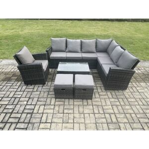 Set Dimensions: 2 x Three Seater Sofa : 177W x 65D x 66H cm; 2 x Fully assembled stools Size: 40Lx 40Wx34H cm; 1 xTable Dimension: 140 L x 80 W x70 H cm (Transparent tempered glass ); Dark grey mixed rattan with dark grey fabric .Color may some difference due to light or monitor .we are unable to return the item due to color problem .the product is delivered on pallet, to kerbside only. Fimous PE Wicker Outdoor Garden Furniture Set Patio Rattan Rectangular Dining Table Sofa with 2 Stool 8 Seater in Dark Grey