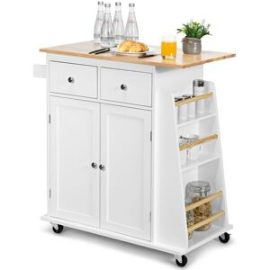 Make your kitchen work easy and enjoyable with our kitchen island cart!Equipped with a wide solid wood countertop, a 2-door cabinet, 2 drawers, a towel rack and a 3-tier spice rack, this kitchen island on wheels provides sufficient storage space for your kitchenware and can make them well organized. The shelf inside the cabinet can be adjusted to 3 different positions to meet diverse storage needs. The towel rack on the side can also be used as a convenient pushing handle. Made of solid rubber wood and durable MDF, this kitchen island cart ensures excellent stability, load-bearing capacity and a long service life. Besides, with 4 universal wheels (2 lockable), the kitchen island is easy to move and can be secured in any place you need. The modern and simple design makes it a great decoration in your kitchen, dining room, living room, etc. Brambly Cottage Base Finish: Black